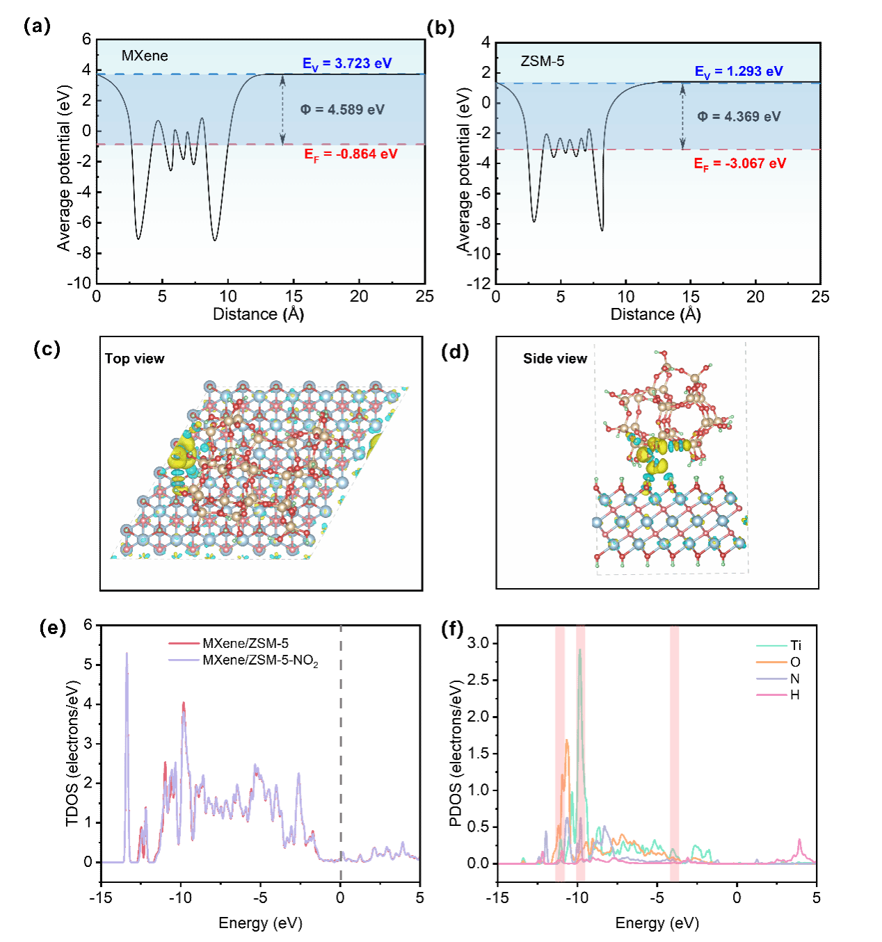 图3. (a-b) MXene和ZSM-5的表面平均静电势与功函数;(c-d) MXene/ZSM-5-NO2吸附模型的差分电荷密度图;(e) 吸附NO2前后体系的总态密度(TDOS)曲线;(f) 吸附模型的投影态密度(PDOS)曲线。