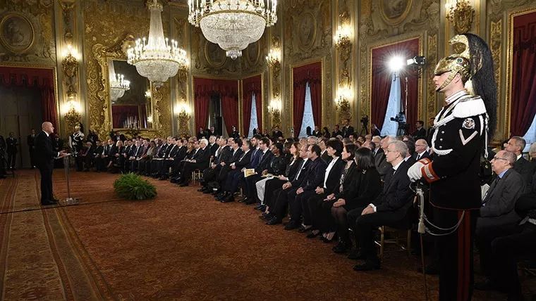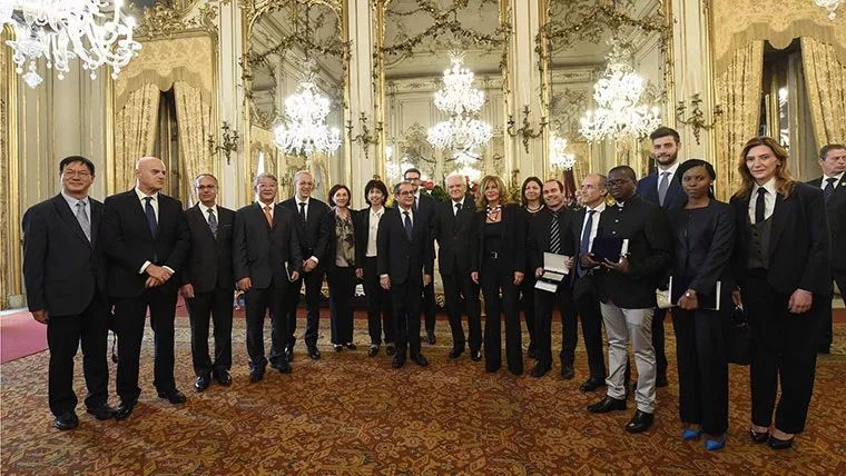 (意大利总统马塔雷拉与获奖科学家、埃尼集体领导及其相关工作人员等合影)