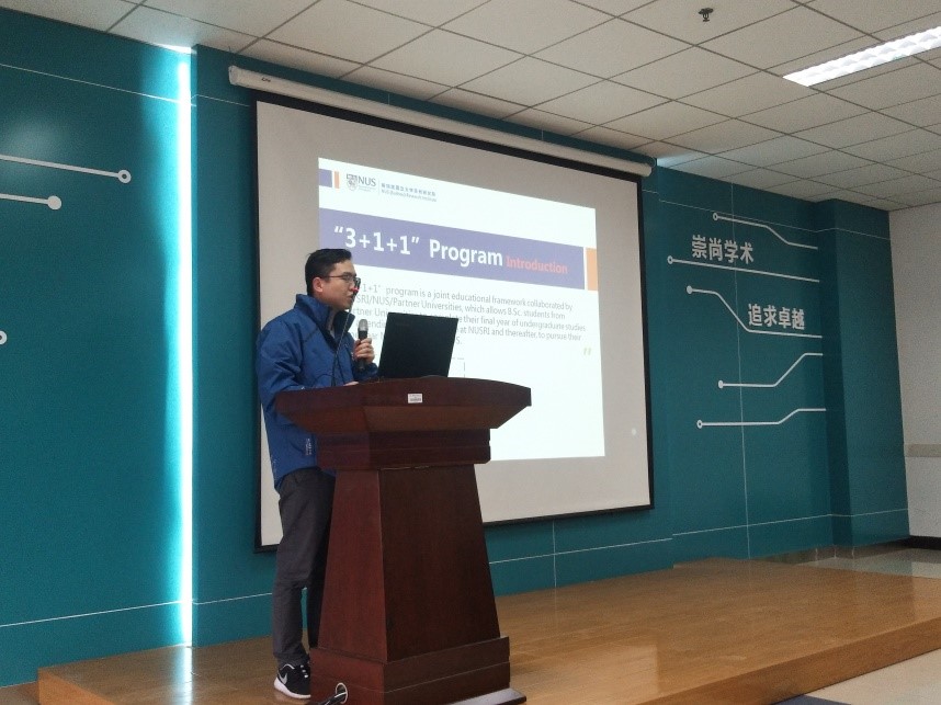 随后,新国大苏研院的戴念为在场师生详细介绍了新国大苏研院的概况、联合培养项目的优势特色、学习模式、申请条件、录取流程、新国大卓越的教学资源和科研成果等,同时,他还从英语写作与交流、科学技术讲座、MSE课程和毕业设计4个方面介绍了第四年新国大苏研院的衔接课程,并通过近几年该项目员工的就业、深造数据,直观的展示了“3+1+1”的项目优势。
