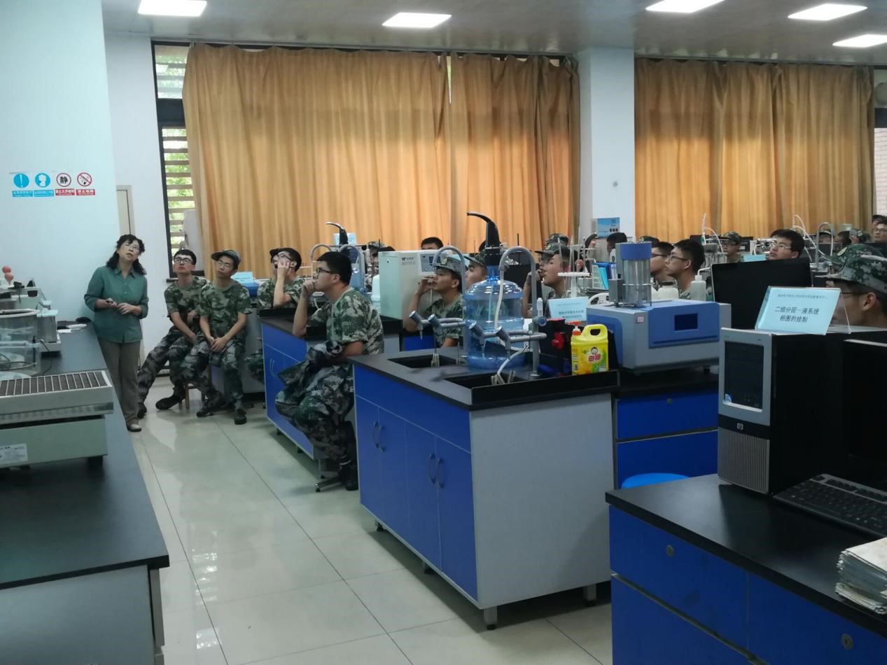 在F223化学实验室,应用化学系主任梁燕萍教授为大家介绍应用化学专业的特色及前景,让同学们了解实践教学在人才培养中的作用,接着梁老师引导大家参观物理化学实验室并简单介绍了物理化学实验的特点,激发了同学们的浓厚兴趣;在F204现代仪器分析实验室,王琦老师通过精密仪器展示了化学在实际中的应用,引起了同学们的阵阵惊叹。在G114材料实验室,材料系主任李智敏教授为大家介绍了材料科学与工程专业的特色和前景,施建章副教授带领大家参观先进材料虚拟仿真实验室,为大家介绍各种高尖端仪器的用途。在G104分析测试中心,吴巍炜副教授细致讲解有关仪器设备的功能、应用,加深了同学们对于化学和材料专业“精确精密”特点的理解。