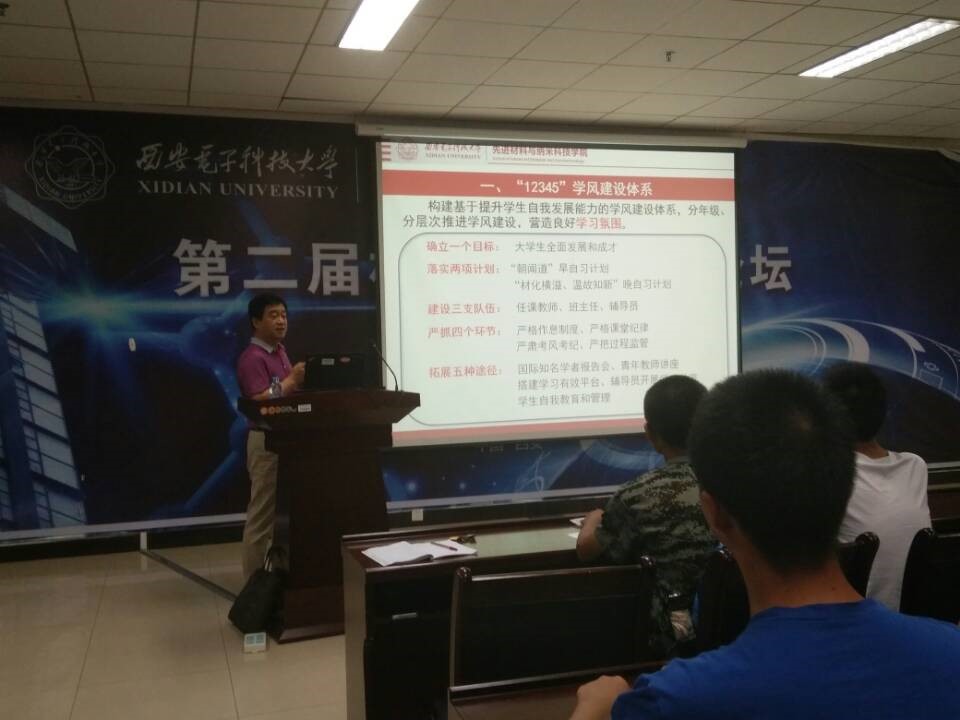 接着,李培咸为新生作了一场别开生面的入学讲座。他从公司的研究方向入手,结合物理化学领域的诺贝尔奖成果,逐步将同学们引入奥妙的科学世界,唤起新生们浓厚的专业兴趣。李培咸从半导体照明、微波功率材料与器件、纳米材料与低维材料、敏感材料与器件与新型电池相关材料等五个研究领域做了清晰扼要的介绍,还与同学一起探讨了“光”的奥秘与应用,并展开了良好的互动交流,为同学们展现了科学的神奇与魅力。李培咸风趣生动的讲解不仅使同学们对专业研究有了深入的认识,也对自己接下来的老员工涯充满了信心。然后,李培咸用更加情怀的方式为新生的老员工涯及人生发展提供了建议。从三个“什么”、四个“学会”入手,引导新生如何学习、做人、做事及与人相处,诠释了成功的路上不仅需要方向、梦想、高度,更需要坚持、合作、充实完善自我,以实现人生的强大,强大到让自己平静与善良,实现真正意义的成功。