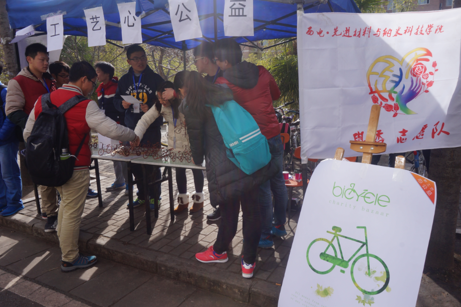 此次活动由设计中心制作的义卖产品——手工制作微自行车。小车的款式多种多样,每一辆都小巧精致,由设计中心成员亲手制作,倾注了大量的心血。志愿者队负责义卖活动筹集善款,精心策划外场活动。上午九点半,两部门成员便纷纷行动起来,布置好外场,将精心制作的手工小车展示出来。手工艺品一经展示,便吸引了很多员工的注意,大家纷纷对小巧玲珑的自行车表示惊叹不已,很多人都动心购买了工艺品小车。上午12:30左右,更多的同学都围在义卖现场,挑选自己喜欢的款型,经过一场抢购高潮,下午1点左右时,现场小车所剩无几。为了募集到更多的善款,也为了让更多的同学可以买到心爱的工艺品,设计中心的同学又赶制出一些漂亮的自行车,成功出售。最终义卖活动于下午6点钟结束,活动取得圆满成功。