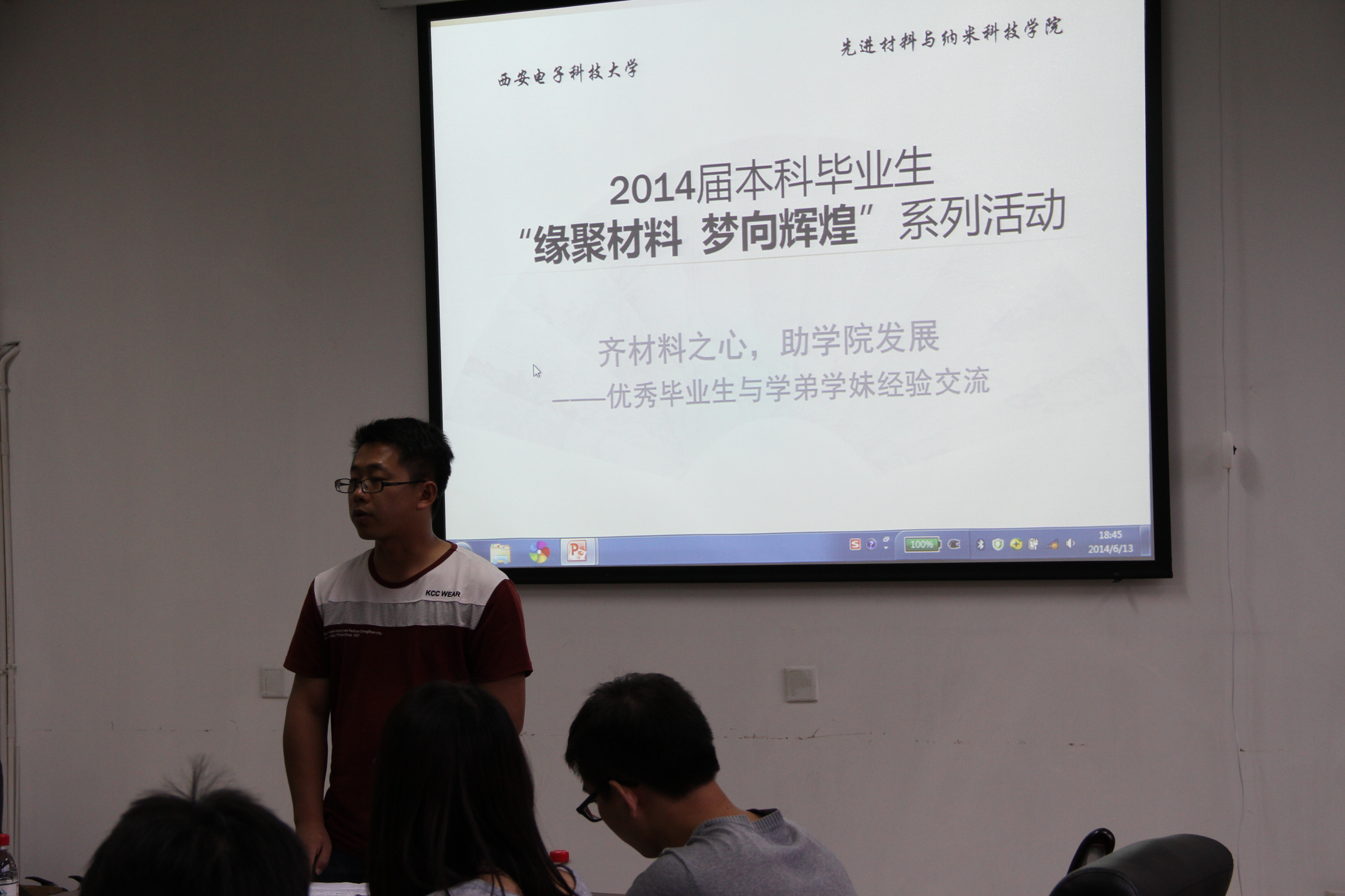 交流会于19点正式开始,材料院材料专业和化学专业共五位学长学姐出席了本次交流会。首先接受同学们提问的是材料专业的刘珏学姐,她在大学期间曾获得国家奖学金一次,校级奖学金若干次,并在大四上学期选择留学至美国宾夕法尼亚大学。她在回答学弟学妹们关于出国深造的问题时提到:一个人保持清醒的头脑是在留学道路上一个重要的素质,我们的本科生不能将出国留学当作神圣的、高不可攀的活动,而是当作自己开阔眼界、增长见识的途径,并时刻保持自己为国争光,报效祖国的信念。应用化学专业保送浙江大学的王虎学长曾数次获得“优秀员工标兵”的称号。他从生活、读研和老员工兼职三方面对学弟学妹们提出了自己的宝贵意见。他认为,必须看清楚上研或工作的本质,读研其实也是另一种工作平台或者说是另一种工作环境,要在为自己上研的奋斗过程中找准自己的目标和关注点,时刻提醒自己努力奋斗。随后,王虎学长分享了自己参加浙江大学夏令营的经历和经验。随着交流会的进行,材料院保送中科院半导体所研究生的陈光灿学长、竞赛达人沈海明学长和工作标兵张攀豪学长分别分享了自己的老员工活心得体会。