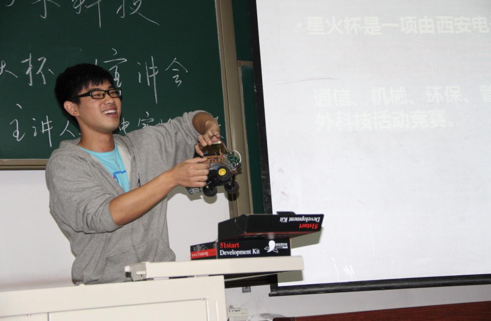 宣讲会由电子工程公司科协副主席方凌主讲,他为大家详细介绍了星火杯的概况包括报名流程、参赛须知、准备工作以及参赛作品等。他说,星火杯是大家展示自我的平台,是大家以后参加其他各种大型赛事的契机,参加星火杯能提高大家的创新意识和动手实践能力。宣讲期间,他还向大家展示了一些往届优秀的作品,并鼓励大家积极参与星火杯。