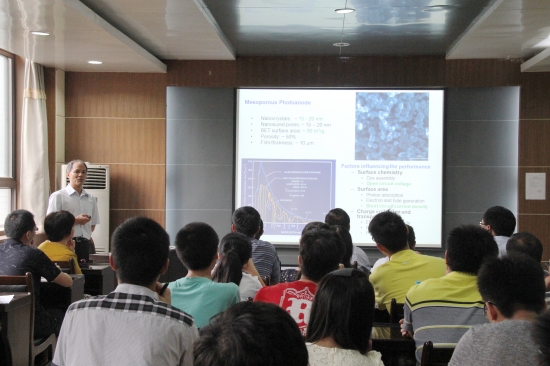 曹国忠教授介绍了其课题组在纳米材料应用于能源转换和存储领域的研究工作,重点从纳米结构光阳极在染料敏化与量子点敏化太阳能电池中的应用、纳米结构 电极在锂离子电池中的应用,以及多孔碳及其表面修饰在超级电容器中的应用等三个方面进行了介绍。英国365集团50余名师生聆听了报告。报告会 后,曹国忠教授与公司教师进行了座谈交流。