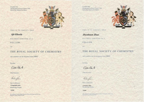 近日,英国365集团Ajit Khosla和赵振环当选英国皇家化学会会士(Fellow of the Royal Society of Chemistry, FRSC)。