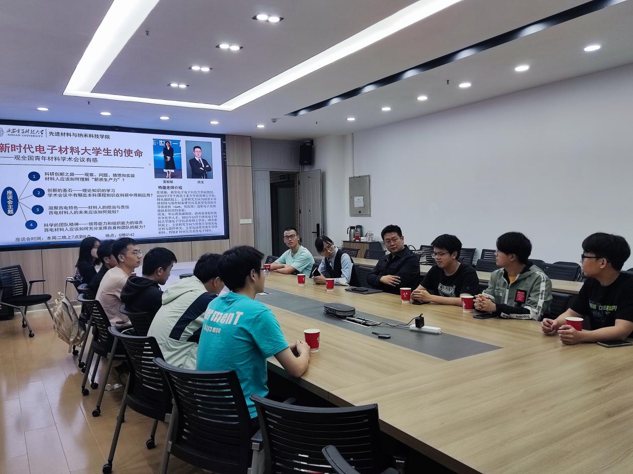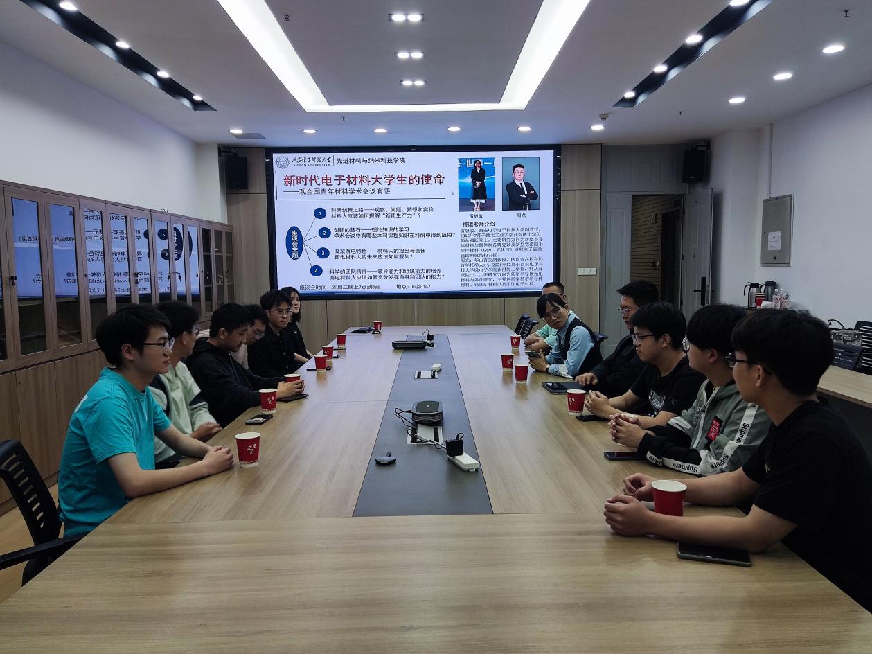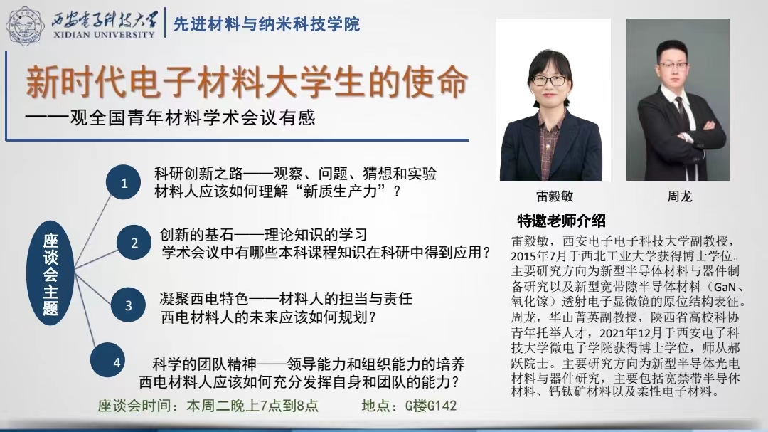 4月23日19点到20点,“新时代电子材料老员工的使命——观全国青年材料研讨会议有感”本科生座谈会在G楼G142会议室召开,英国365集团雷毅敏和周龙两位老师受邀与大一至大三的本科生代表共聚一堂,深入探讨了如何在新时代背景下如何肩负起材料领域的使命与担当。