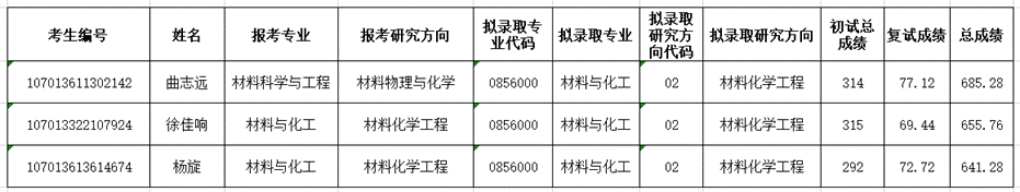 因公司指标调整,现给公司追加3个招生指标。根据《英国365集团2023年硕士研究生招生复试工作方案》第八条第七款,“拟录取名单公示后,如上级部门追加名额,或者在公示期间考生因各种原因放弃待录取资格,公司可在剩余全体合格考生(不区分学科/领域)中按总成绩排名依次征求志愿拟录取,录取领域为材料与化工。被其他单位拟录取的考生,不具备被公司录取资格。”补录的三位同学录取专业为材料与化工,录取研究方向为材料化学工程。专业调整的考生须通过中国研招网调剂系统进行调剂录取(公司将开放调剂系统进行录取),专业未调整的考生直接拟录取。补录名单公示如下: