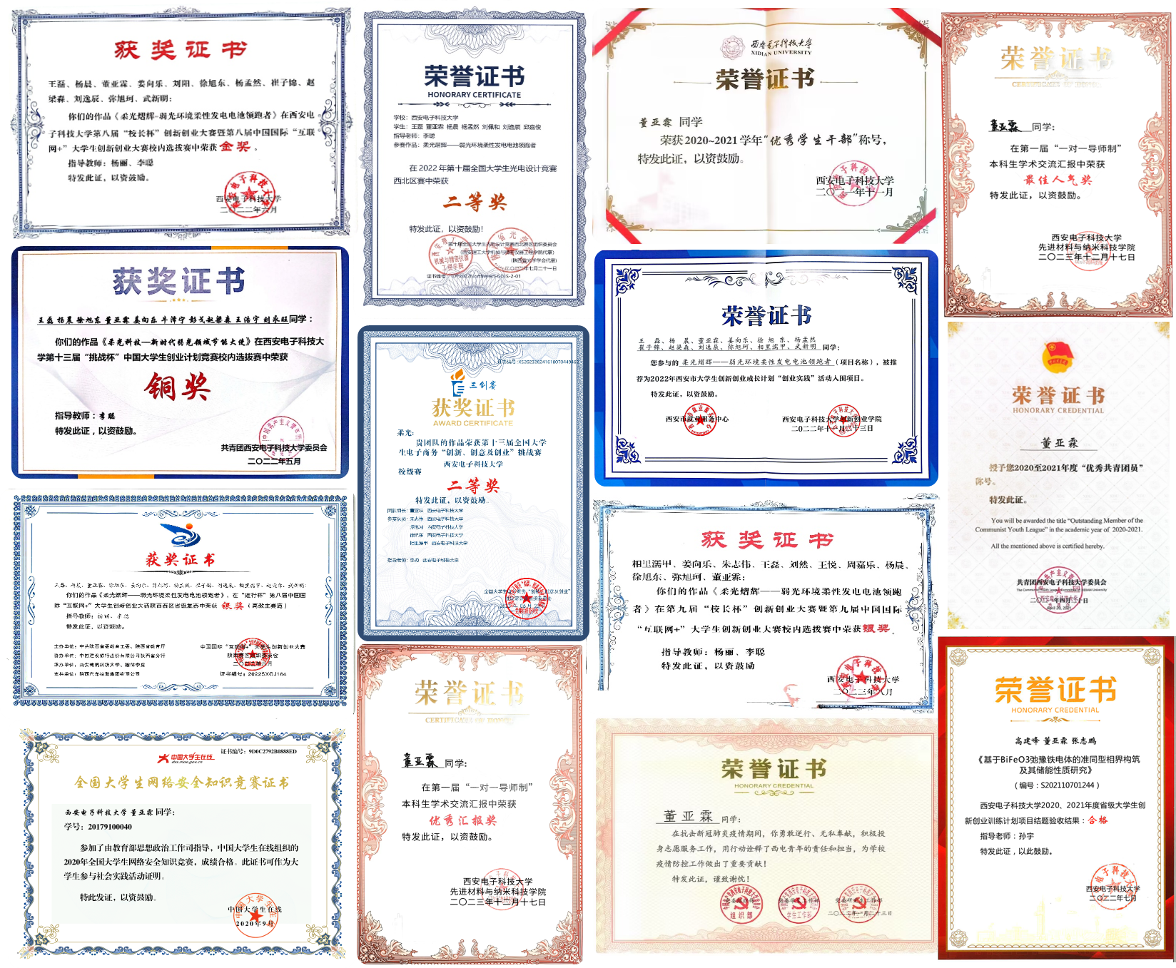 一直以来,董亚霖都很重视课程知识的学习,除了课上认真听讲、课后及时复习总结之外,多向老师、同学请教是他最擅长的学习方法。“大学的课程知识比较难,幸好公司的任课老师很负责,常常在课后耐心地解答我们的问题;除此之外,身边优秀的同学也是我学习的榜样,和其他同学的交流更能加深我对知识概念的理解”。正是有了这些良好的学习习惯,董亚霖在高等数学(97)、场论与复变函数(99)、半导体物理(97)等课程上得到了较高的分数。在课业学习之余,董亚霖也积极参与学科竞赛,将所学的专业知识用于实践,加深对知识的理解和应用,目前已经获得了包括中国国际“互联网+”老员工创新创业大赛省级银奖、全国老员工光电设计竞赛省级二等奖等省级及以上奖项5项、校级奖项4项。