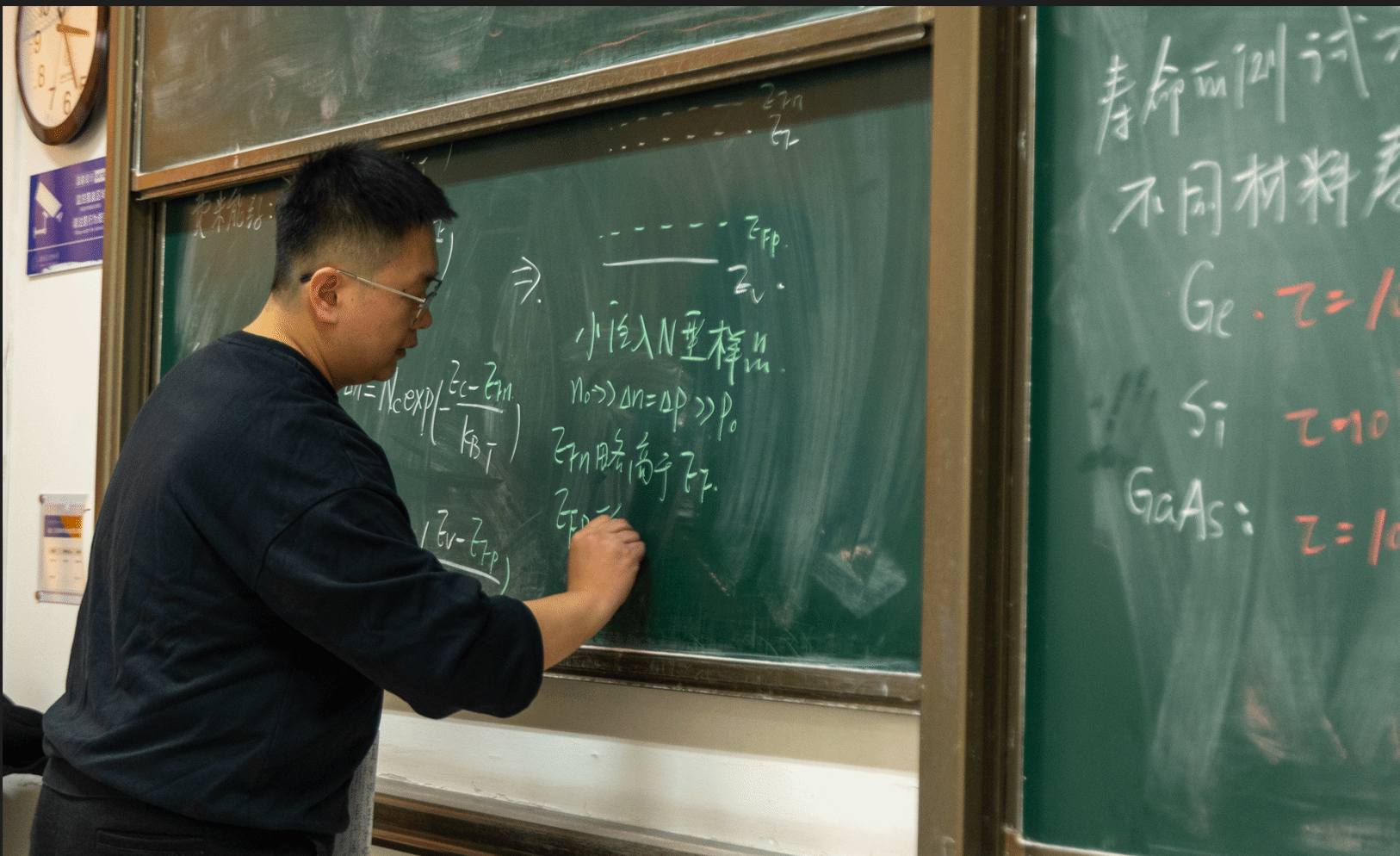 “作为一名教师,站稳讲台是首要任务。”为此,周龙一直向公司的教学名师和前辈虚心求教,汲取教学经验和智慧。在担任助教期间,周龙参与了黄云霞老师省级精品课程《固体物理》的建设和学习,深刻体会到了教师站稳讲台的艰辛与不易。黄云霞老师认真负责的教学态度,以及“讲好课,育好人”的教学理念,深深地影响了他,成为他教员工涯中的宝贵财富。“目前,我主讲《固体物理》《半导体物理》《固体电子器件》课程,课程量不算多,因此每一次备课,我都会精心规划板书的内容,力求做到既简洁明了又生动有趣。” 在讲台上,周龙总是充满激情和活力,善用生动的例子和有趣的故事,来激发员工的学习兴趣和求知欲,让员工在学习过程中能够有所收获。课后,员工们也愿意主动找周老师请教问题,共同探讨学术难题。这种良好的师生关系不仅促进了员工的学习进步,也为员工今后的科研道路奠定了坚实的基础。
