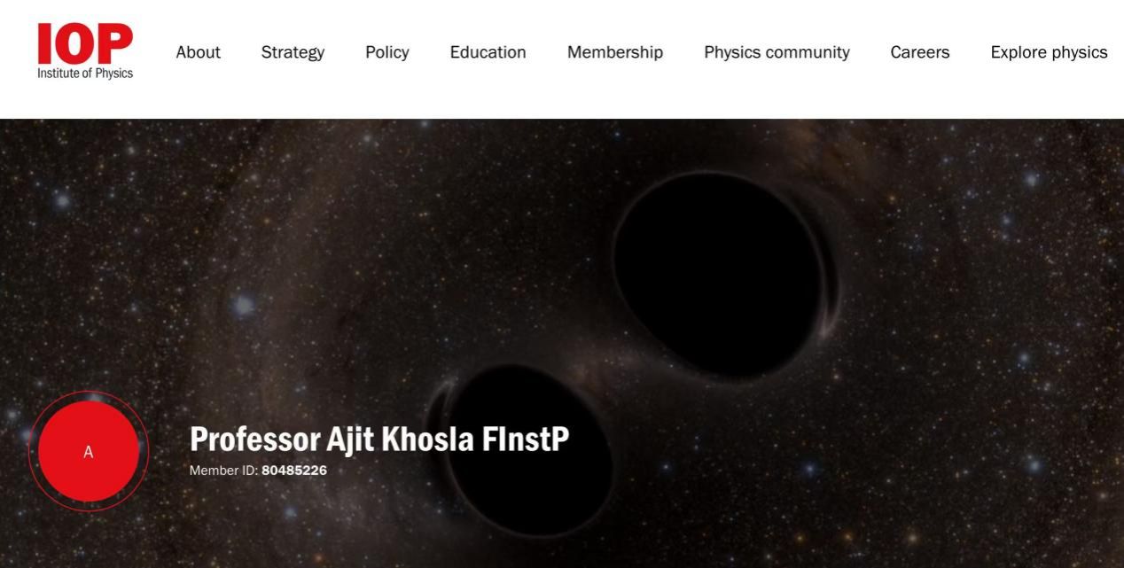 英国物理学会(IOP)在贺信中充分肯定了Khosla教授在物理学相关领域的卓越成就,并欢迎他加入这一全球顶尖的物理学专家社群。作为新晋会士,Khosla教授将享有包括全球学术合作、专业发展支持、每月获赠《Physics World》杂志等多项权益,并可在姓名后使用“FInstP”称号。