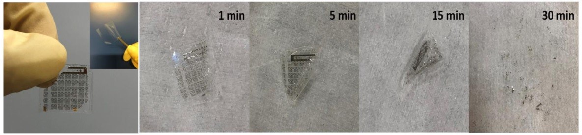 课题组提出一种水辅助转印方法,将采用传统微纳加工技术制备的器件阵列转移到瞬态基底上,得到了一种可物理消失的模拟神经元间信号传导的忆阻器(30分钟内可在水中完全溶解),可以很好的实现神经突触的短期可塑性,这为实现安全的神经形态计算应用打下了基础。