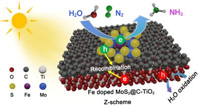 当前,双碳问题是世界各国面临的重大问题,实现碳达峰、碳中和,是着力解决资源环境约束突出问题、实现国家永续发展的必然选择。氨是现代农业氮肥的主要合成原料,也是主要的工业化学品原料,更是潜在的无碳能量载体。然而,全球氨的主要来源来自于哈珀法,该方法采用高温高压反应制备氨,同时其所需的原料氢气则主要依靠化石原料的重整,该重整过程不仅能耗高,还排放大量的温室气体。据统计,平均每生产一吨氨,排放约两吨二氧化碳气体。光催化固氮是一种潜力巨大的清洁技术,其利用半导体材料吸收太阳能,产生电子和空穴,光生电子可在温和条件下将惰性的氮气分子还原为氨。因氮还原为氨过高的还原电位,导致合适的催化剂非常少。同时惰性的氮气分子在催化剂表面的极慢反应动力学,导致固氮效率仍然较低。基于此,研究人员首先通过设计制备铁掺杂二硫化钼纳米结构,模拟生物固氮酶的活性中心,同时与具有多孔结构的碳-二氧化钛纳米片复合,制备全固态z-型复合光催化剂,引导光生载流子的分离与传输,充分利用具有更高能量的光生电子还原氮气分子,获得了较高的产氨效率。