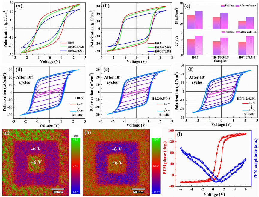 为了制备出Hf/Zr元素非均匀分布的Hf0.5Zr0.5O2铁电薄膜材料,研究团队首先进行图1(a)所示的结构设计,并分别利用原子层沉积技术和磁控溅射技术进行铁电薄膜材料和W金属电极制备。结合图1(b)-(o)的GIXRD图谱和TEM照片可以观察到薄膜内部铁电正交相的存在。进一步利用铁电分析仪和压电响应力显微镜(PFM)分别对制备的氧化铪基铁电薄膜的电滞回线和电畴翻转特征进行表征分析,如图2所示。无论对于唤醒前还是唤醒后的薄膜样品,均呈现出典型铁电体的电滞回线,并且没有观察到类反铁电体的双电滞回线特征,表明制备的薄膜样品含有大量的铁电正交相。当外加电压达到2V以后,剩余极化强度随测试电压增加而缓慢变化,表明在2V较低电压下便接近饱和状态。PFM相位和振幅图中明显的衬底对比反映向上和向下的极化状态,结合PFM滞后回线可以观察到接近180°的电畴翻转,表明制备的薄膜材料具有优异的铁电性。