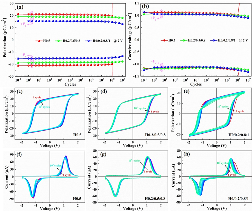 从图中可以观察到Hf/Zr元素非均匀分布有助于改善剩余极化强度的频率稳定性,尤其是H0.2/0.5/0.8样品不仅表现出较大的剩余极化强度和优异的稳定性,而且矫顽电压相较于其他样品得到降低。为了进一步探究不同Hf/Zr元素分布的Hf0.5Zr0.5O2薄膜电容器铁电性能的循环耐久性,测试得到剩余极化强度、矫顽电压、电滞回线和电流-电压曲线随循环次数变化特征,如图4所示。从图中可以观察到剩余极化强度随循环次数增加略有减低,尽管Hf/Zr元素均匀分布的H0.5样品呈现出最大的剩余极化强度值,但是在108次循环后便发生了击穿现象。相比之下,Hf/Zr元素非均匀分布的H0.2/0.5/0.8和H0/0.2/0.8/1样品的循环次数可以提升1个数量级以上,尤其是H0.2/0.5/0.8样品的2Pr在经过109次循环后依然可以达到36 μC/cm2,相当于疲劳前的94%。同时,矫顽电压的绝对值在109次循环测试过程中始终维持在0.96~1.24 V之间。