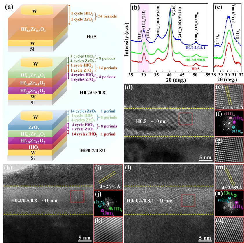图1 不同Hf/Zr元素分布的Hf0.5Zr0.5O2薄膜电容器设计示意图、GIXRD图谱和TEM照片