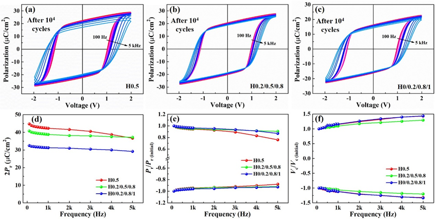 图3 不同Hf/Zr元素分布的Hf0.5Zr0.5O2薄膜电容器的电滞回线以及剩余极化强度和矫顽电压随频率变化曲线