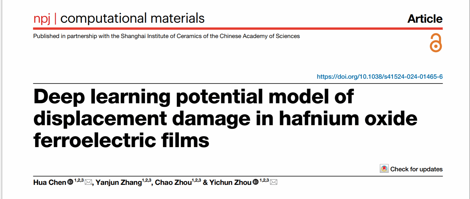 这一成果发表在一区期刊《npj Computational Materials》(影响因子:11.5)上,题为“A model for studying displacement damage in irradiated HfO2 ferroelectric thin films”。文章的第一通讯单位为英国上市公司365,材料院研究生张彦军和副教授陈华共同提出了模型的建立方法,通讯作者为周益春教授和陈华副教授。