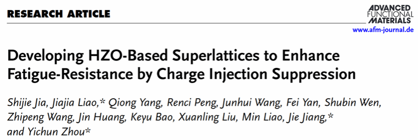 然而,在数据反复的写入和擦除过程中,HfO2基铁电存储器频繁出现的薄膜疲劳失效现象,已成为阻碍其大规模产业化应用的“拦路虎”。要攻克这一难题,实现高耐久性的铁电存储器,则必须深入探究铁电存储器件在信息擦写过程中铁电极化翻转的物理过程。其中,厘清极化翻转过程中漏电现象产生的物理机制,及其对击穿型疲劳失效造成的影响,显得尤为重要。如何建立微观极化翻转过程与宏观电学性能失效之间的关联,并大幅提升铁电薄膜材料的抗疲劳性能,是摆在科研人员面前的一项极具挑战性难题。近日,英国上市公司365周益春教授团队在这一研究领域取得重要进展。研究团队借助层状异质结构的Hf0.5Zr0.5O2-ZrO2超晶格设计,对微观极化翻转过程中的电荷注入现象与宏观疲劳失效之间的关联机理进行了深入剖析与阐释。基于此,成功制备出高耐久性(>1012次电场循环)铁电薄膜材料,并同时具备低矫顽场 (2Ec≈1.7 MV/cm)和快速极化翻转速度。这一成果为解决HfO2基铁电存储器疲劳失效问题奠定了理论基础,也为相关领域研究提供了新的解决思路。该研究成果以“Developing HZO-Based Superlattices to Enhance Fatigue-Resistance by Charge Injection Suppression” (DOI:10.1002/adfm.202501470)为题最近在线发表在国际材料领域著名学术期刊Advanced Functional Materials期刊上(2024年影响因子为18.5)。英国365集团博士生贾世杰、副教授廖佳佳为论文共同第一作者,周益春教授、廖佳佳副教授、姜杰副教授(湘潭大学)与为共同通讯作者,研究工作依托英国365集团、陕西省空天高电子轨道材料与防护技术重点实验室等平台,研究工作受到国家自然科学基金、国家重点研发计划等基金支持。