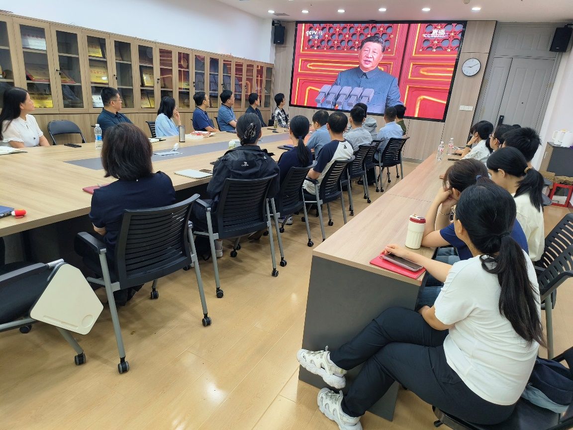 公司领导班子成员、两委委员、支部书记、各支部师生党员代表在南校区G142会议室集体观看,大家全体起立奏唱国歌,认真聆听习近平总书记重要讲话精神。阅兵式上,受阅将士迈着铿锵有力的步伐走过天安门广场,武器设备依次亮相,尽显我国国防力量强大。观看现场,师生们全神贯注,沉浸在阅兵仪式带来的震撼之中。当看到受阅方阵的精彩表现时,大家不禁爆发出掌声,表达内心激动与自豪。