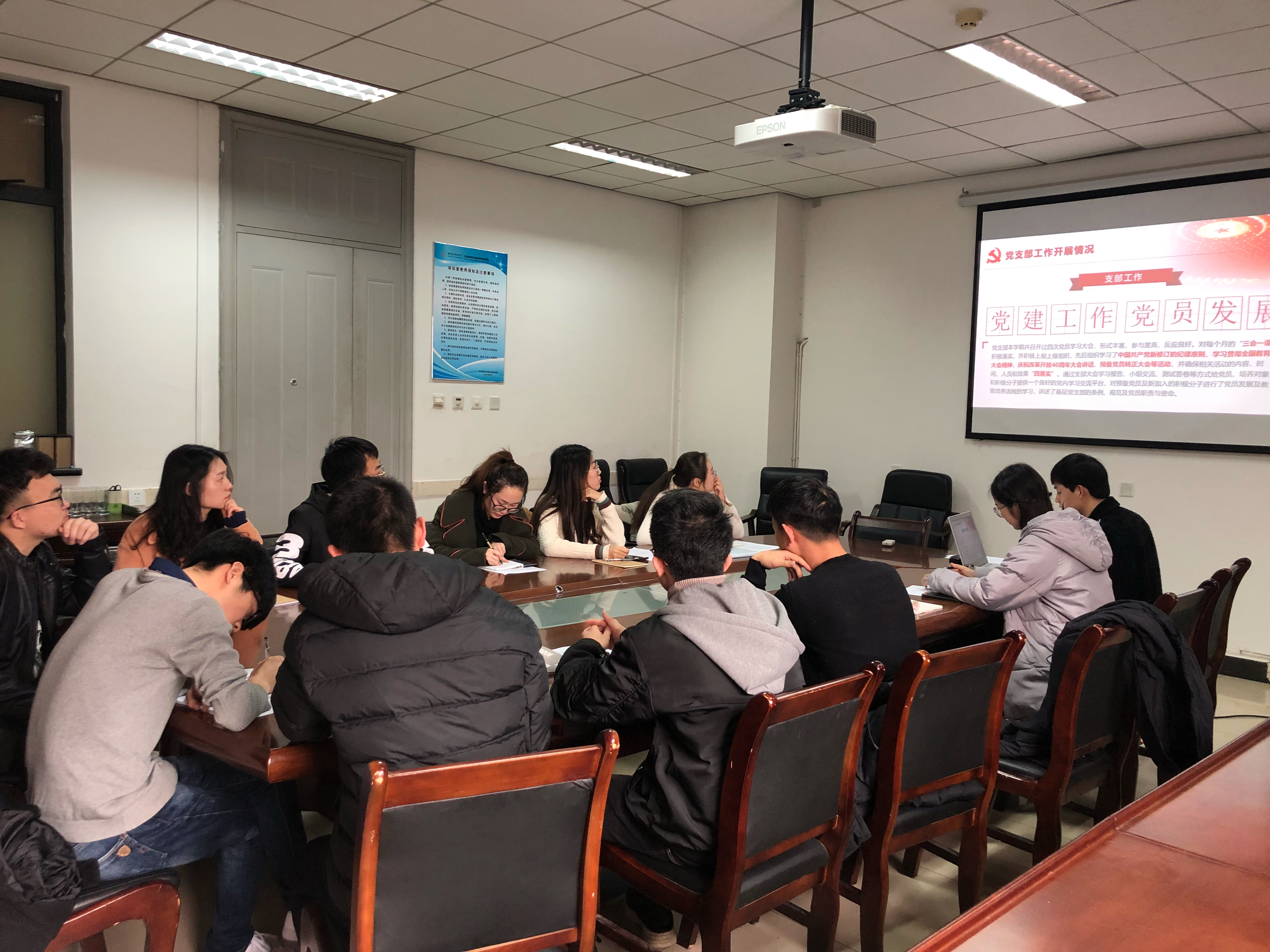 然后,支部所有成员对民主评议党员测评表进行打分,组织委员简瑛瑛对2019年党支部新制定的工作与计划进行安排,在宣传委员张兴茂的带领下大家一起学习观看了《人民代表习近平》等系列宣传片。