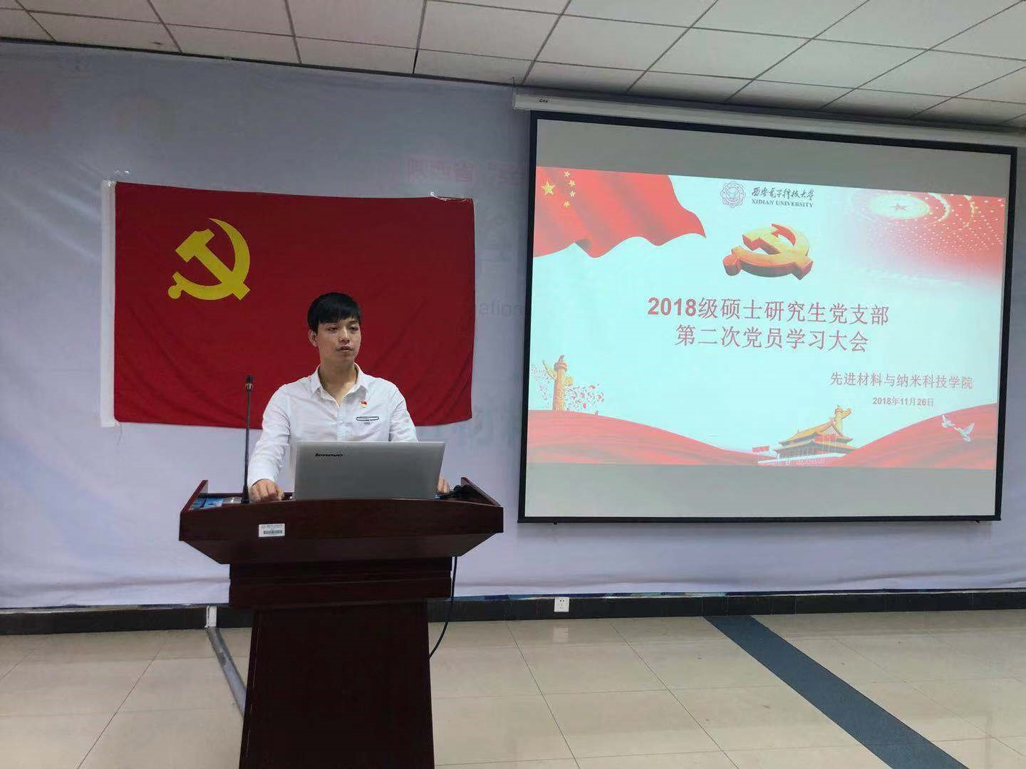 支部书记李鑫主持召开此次会议,宣读本次学习主题,第一党小组成员带领大家对本次会议精神进行学习解读,全体党员及积极分子共同学习了2018年《学习贯彻全国教育大会精神》。接着,宣传委员张兴茂对会议精神提出问题讨论,大家进行了热烈的讨论;组织委员简瑛瑛对全体党员进行党员基本知识测验,会场反应十分积极。最后,支部书记李鑫对预备党员及新加入的积极分子进行了党员发展及教育培养流程的学习。讲述了基层党支部的条例、规范及党员职责与使命。