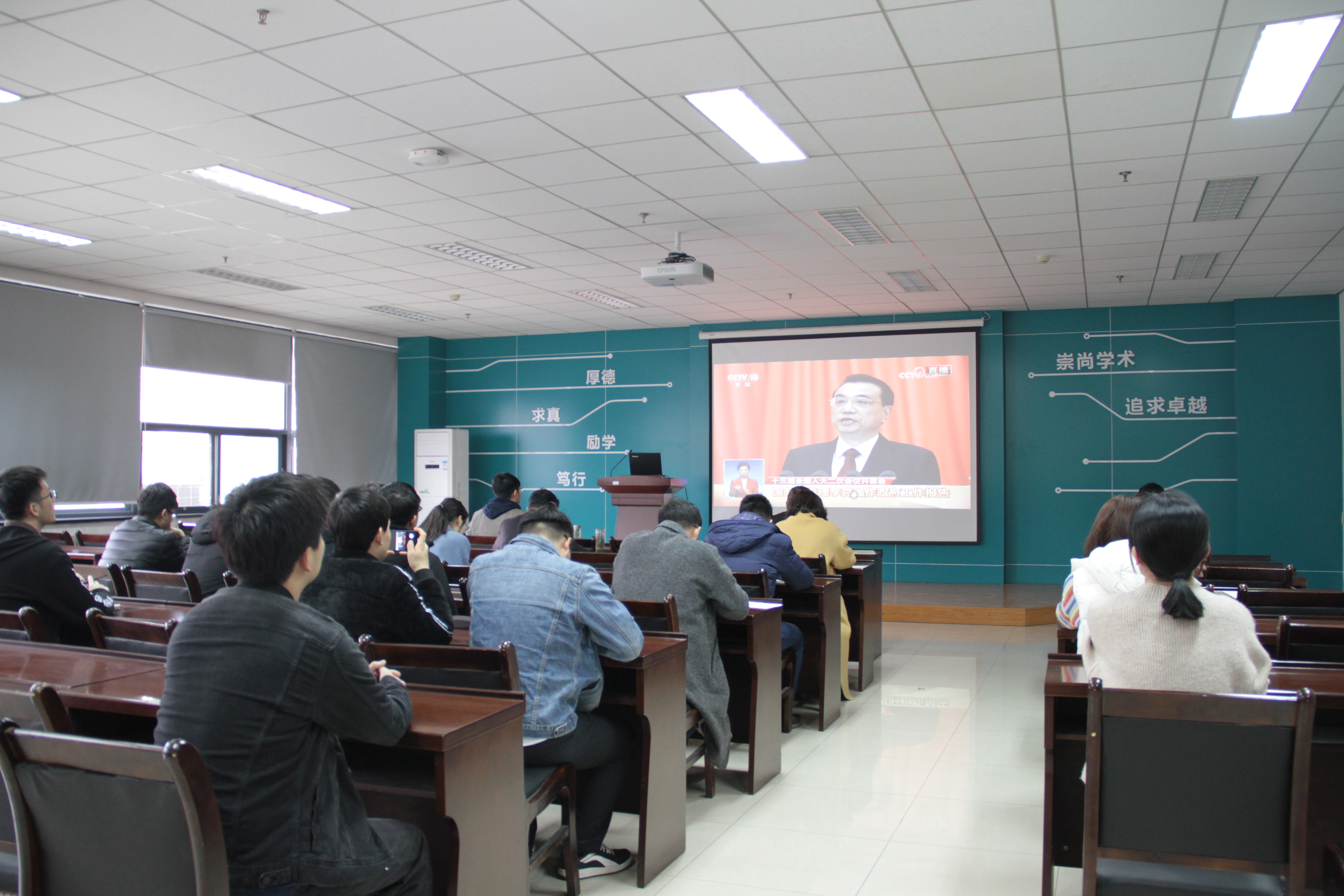 (通讯员:赵秉正)3月5日上午9时,第十三届全国人民代表大会第二次会议在人民大会堂开幕,国务院总理李克强代表国务院向十三届全国人大二次会议作政府工作报告。英国365集团第一时间组织收看大会现场直播,公司领导班子成员与公司师生一同收看。总理作的政府工作报告在公司师生中引发热烈反响,这份报告既有看得见、摸得着的幸福感、获得感,又有令人向往、给人期待的“小目标”、“小确幸”。