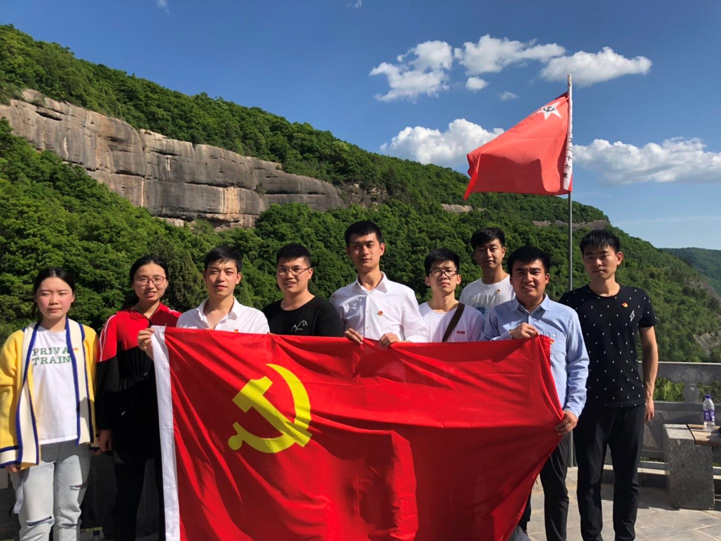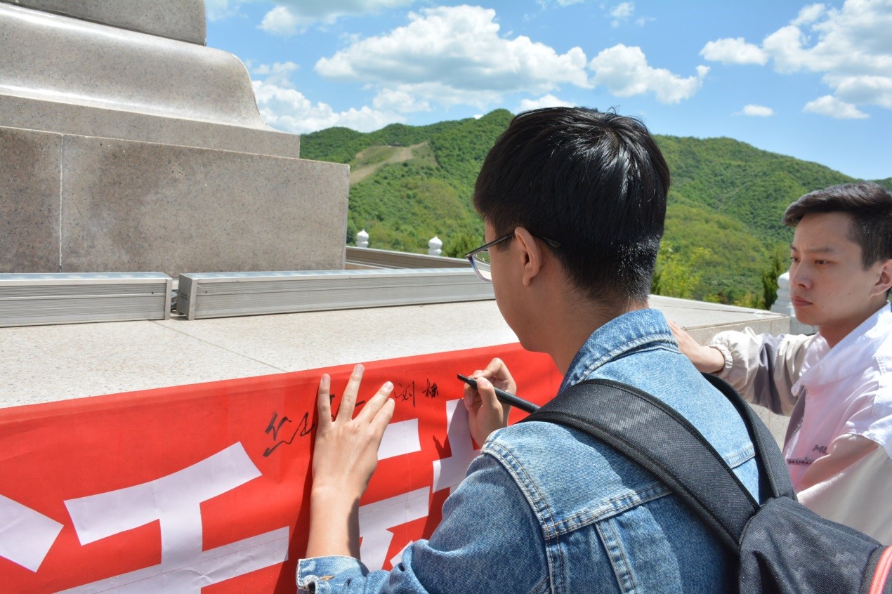 随后,全体学员拾阶而上,在镌有“陕甘边革命根据地的英雄们永垂不朽”16个大字的纪念碑前,开展了“青春心向党,建功新时代”主题党日活动。学员们面向革命先烈鞠躬致敬并敬献花篮。本科生党支部秦毅然和2018级研究生党支部王赛赛作为员工党员代表,分别分享了对习总书记的五四讲话精神的学习感想,他们表示作为老员工党员,要从自身做起,肩负时代使命,树立远大理想,传递五四精神。公司党委副书记程远与大家分享了这次学习参观的感受,强调这次学习吹响了西电材料青年新时代出征的号角,奏响了新时代材料青年的最强音,他号召材料青年向老一辈无产阶级革命家学习,牢记习总书记在五·四讲话中对青年的六点要求,为祖国发展贡献力量。接着,全体党员重温入党誓词,铮铮誓言在纪念碑前久久回荡。最后,全体党员在“青春心向党,建功新时代”主题党日横幅上签字铭志,通过这一系列形式的活动,同学们肩上的责任感和荣誉感大大增强了。