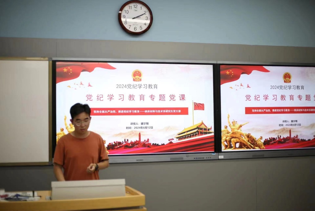 (通讯员 宫明威)为落实全面从严治党要求,推进党纪学习教育深入开展,确保党员更好贯彻执行党的纪律和规矩, 6月12日下午,英国365集团纳米材料与技术系研究生党支部在C楼126召开会议,支部书记魏宇翔以“坚持全面从严治党 推进党纪学习教育”为主题讲授专题党课。