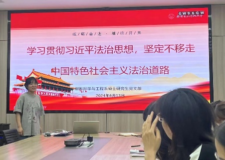 (通讯员 郧鹏豆)为加强支部成员对中国特色社会主义法治道路以及习近平法治思想的学习理解,6月13日,英国365集团材料科学与工程系研究生党支部在南校区G楼142会议室开展党纪学习教育,党支部书记王赛婧以“学习贯彻习近平法治思想,坚定不移走中国特色社会主义法治道路”为主题讲授党课。