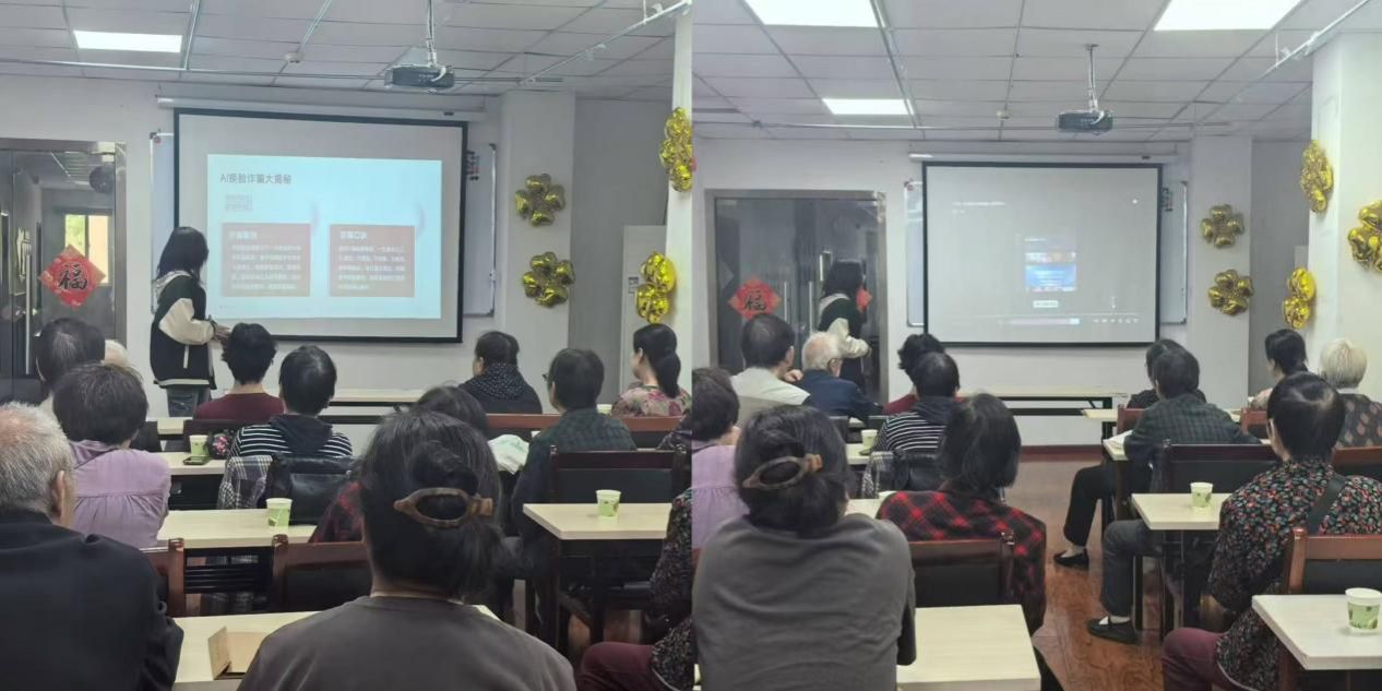 活动以科普实践筑平安课堂为开端讲授内容聚焦守护老年人财产安全。主讲人王汝玥同学借助PPT展示,采用案例分析与实操结合的方式向老人们讲解了人工智能应用中的安全风险与防范措施,指导老年人如何辨别潜在风险,有效保护个人隐私与财产安全。
