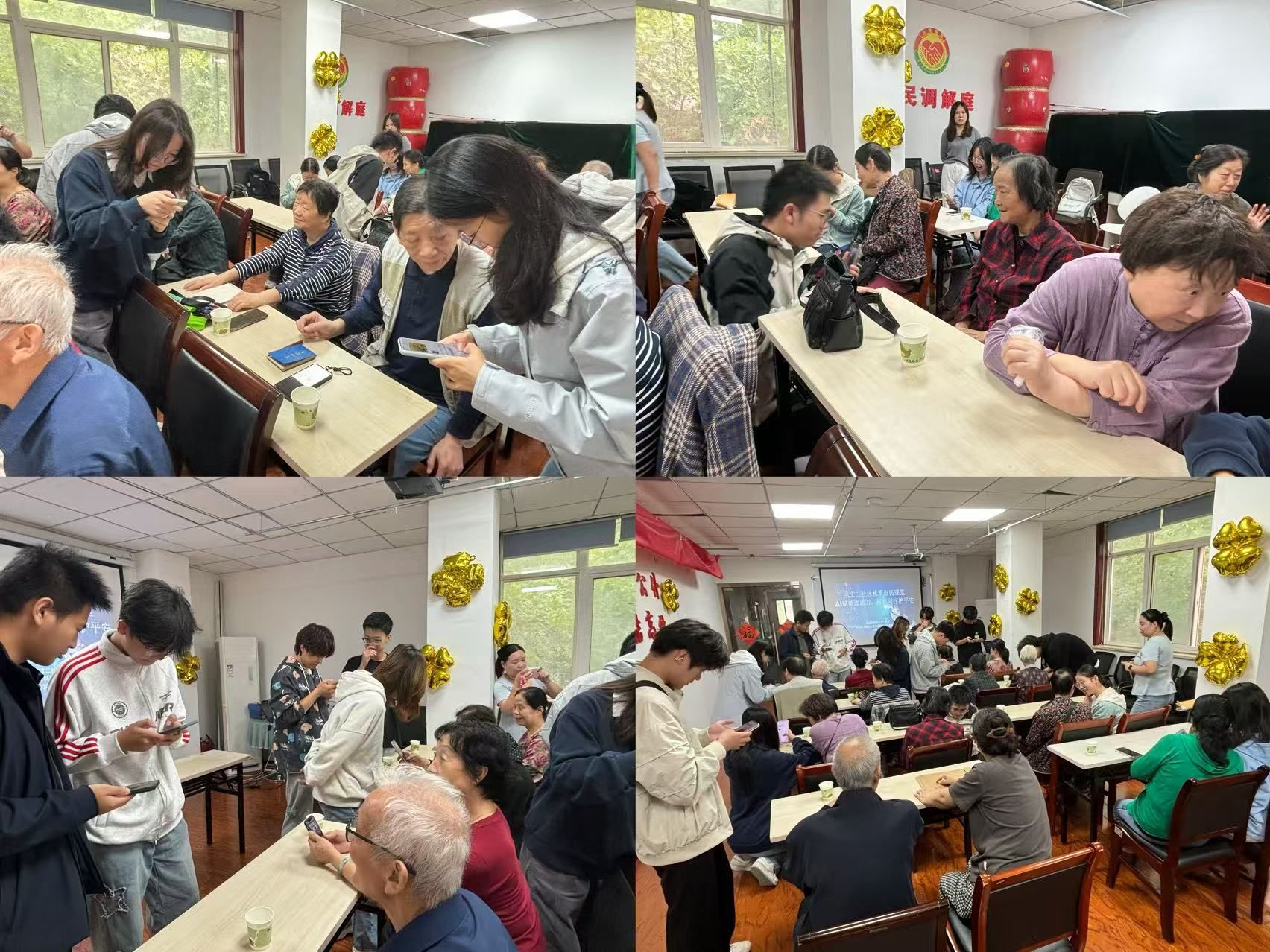 现场气氛温馨而热烈,充满了欢声笑语,志愿者们热情且耐心地解答老人们关于使用智能手机时遇到的种种疑问,老人们也欣然分享着自己的人生阅历与生活趣事,欢声笑语间交织着温暖的代际对话,这一刻仿佛回到了家庭的温馨。2024级本科生张婧分享了活动感悟:起初我以为这只是一次简单的拍照任务,但当我将通过AI技术“重返青春”的照片递到奶奶手中时,她眼中闪烁的惊喜与泪光,让我瞬间领悟了“赋能”二字的真谛。”