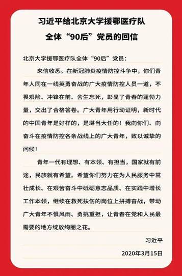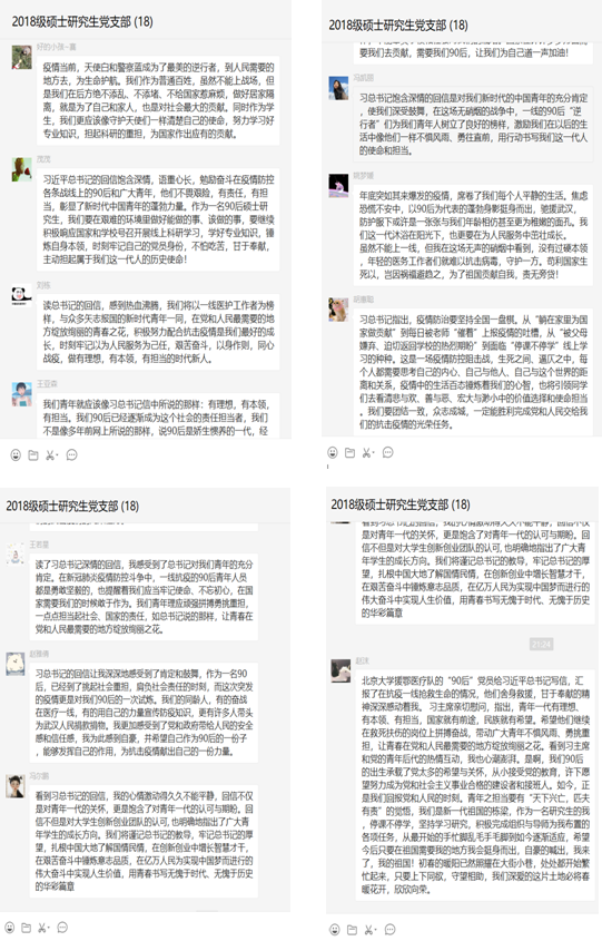 3月15日,中共中央总书记、国家主席、中央军委主席习近平给北京大学援鄂医疗队全体“90后”党员回信,在信中赞扬了他们的担当与责任,肯定了当代青年勇于奋战在抗击疫情的第一线,鼓励着青年一代迎难而上、越战越勇、不负重托,并向他们和奋斗在疫情防控各条战线上的广大青年致以诚挚的问候。3月19日晚上,2018级硕士党支部开展线上集体学习此次回信精神,并展开积极讨论。