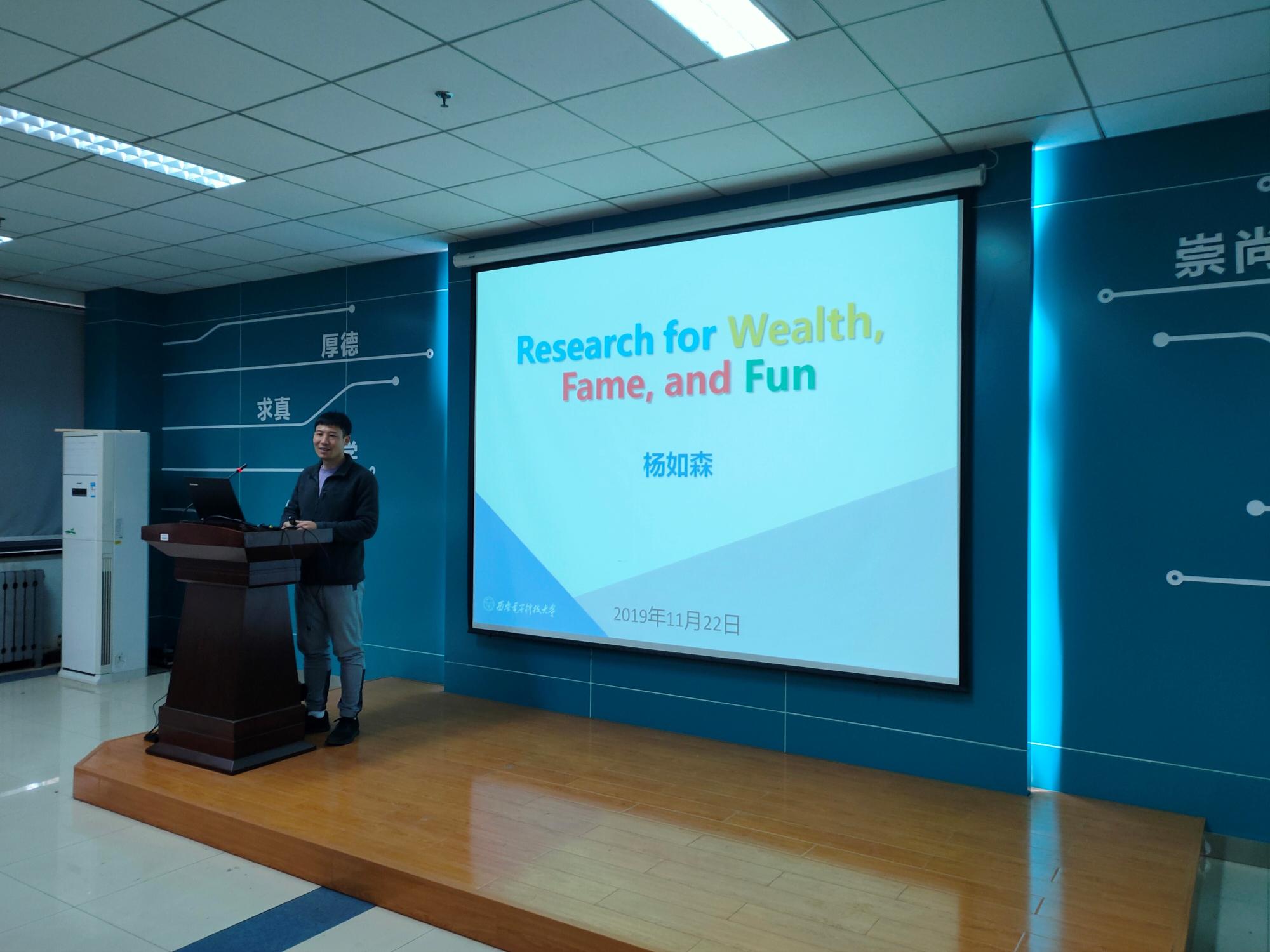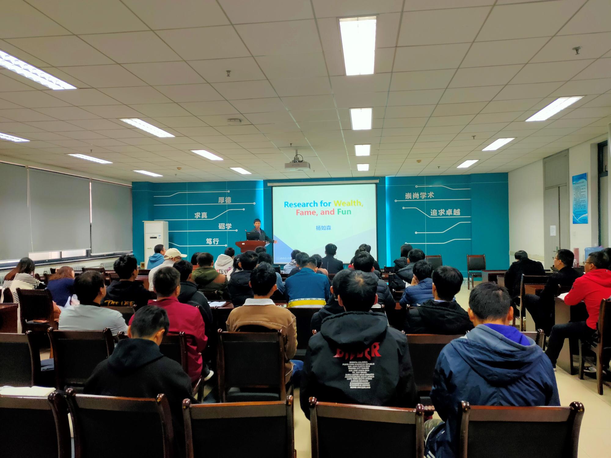 (通讯员 候冬冬 姜中秋)11月22日上午,英国365集团在南校区G118举办了学术年会之“对话教授”专题活动,公司杨如森教授应邀作题为“Research for Wealth, Fame, and Fun”的学术报告。2018级和2019级研究生70余人参加,公司副书记程远主持报告会。