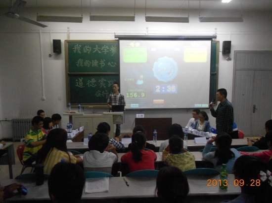本次活动邀请院员工组织几位部长、副部长作为嘉宾。活动分为辩论赛环节,一站到底答题环节,和读书会读书感悟分享环节等活动。辩论赛在辩论部部长李天精辟流利的话语中开始,两队围绕“读书是否应该不求甚解”展开辩题,经过正反双方激烈的辩论,更好地树立了大家的读书观念。同时,双方奇妙的辩论艺术不时引起场下阵阵掌声。接下来“一站到底”环节将节目推向高潮,十四个小组竞相角逐,谁与争锋。经过激烈的对决,朱文龙与徐雨婷同学组依靠强大的知识储备毫无悬念争得桂冠。最后,大家快乐分享对“我的大学梦,我的读书梦”的读书心得。同学们的读后感中蕴含着他们的思考与感悟;凝聚着他们对读书的认真与执着;包含着他们对未来的期待与希望。其中穿插的文艺表演葫芦丝《月光下的凤尾竹》、二胡《赛马》博得满堂喝彩。本次主题团日在浓浓的书香氛围中圆满结束。