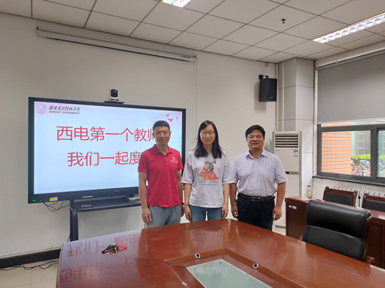 座谈会最后,在“西电第一个教师节,我们一起度过”的背景前,公司班子成员和新进教师合影留念。
