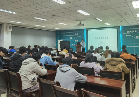 吴巍炜用“无知者无畏”“善泳者溺”作为本次讲座的开场,从一些具体的案例着手,分析了事故的原因、经过和经验教训。他又对化学试剂的安全操作、玻璃仪器的安全操作规范、化学实验室事故防范和应急处理等实验室日常操作程序做了普及,教育同学们日常做实验时应注意哪些问题,当遇到突发情况时应如何保护自己。
