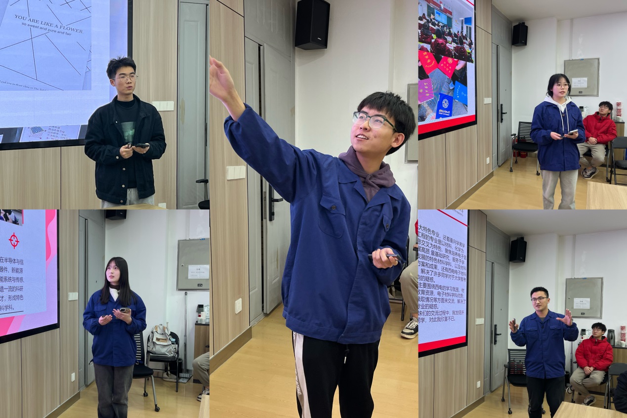 交流会上,曾就读于四川宜宾市第一中学、陕西汉中龙岗公司、河南省实验中学、安徽定远英华中学、新疆乌鲁木齐市第七十中学的刘家铭、李昕怡、杨晨、孔雨萌、王昊烨等同学,围绕实践主题,分别从家乡及高中母校情况、特色做法、家乡学子反响、个人实践心得等方面,分享了本次意义非凡、成效突出的实践经历。一张张生动的照片、一段段有趣的故事展现着西电材料人的自信、自豪和奋发有为的精神面貌,展现着西电人爱校、荣校、兴校的责任担当。在座谈环节,同学们争先发言,师昌绪电子材料菁英班朱晓萌同学讲述了招生宣讲对大山学弟学妹们启梦、追梦、圆梦的引领作用,邢文卓同学讲述了小镇学子们对公司“一对一导师制”培养制度的憧憬和期待等场景。