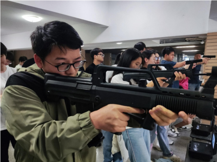 现场员工分成五组射击,十发实战,这是一场技术与细心的角逐,模拟枪声此起彼伏,场外更是传来阵阵惊呼,电子打靶系统实时反馈着同学们的射击成绩,每一次射击都是对同学们技艺的考验和心理素质的锻炼。在紧张刺激的氛围中,同学们不断提升自己的射击水平,也收获了满满的成就感和自豪感。