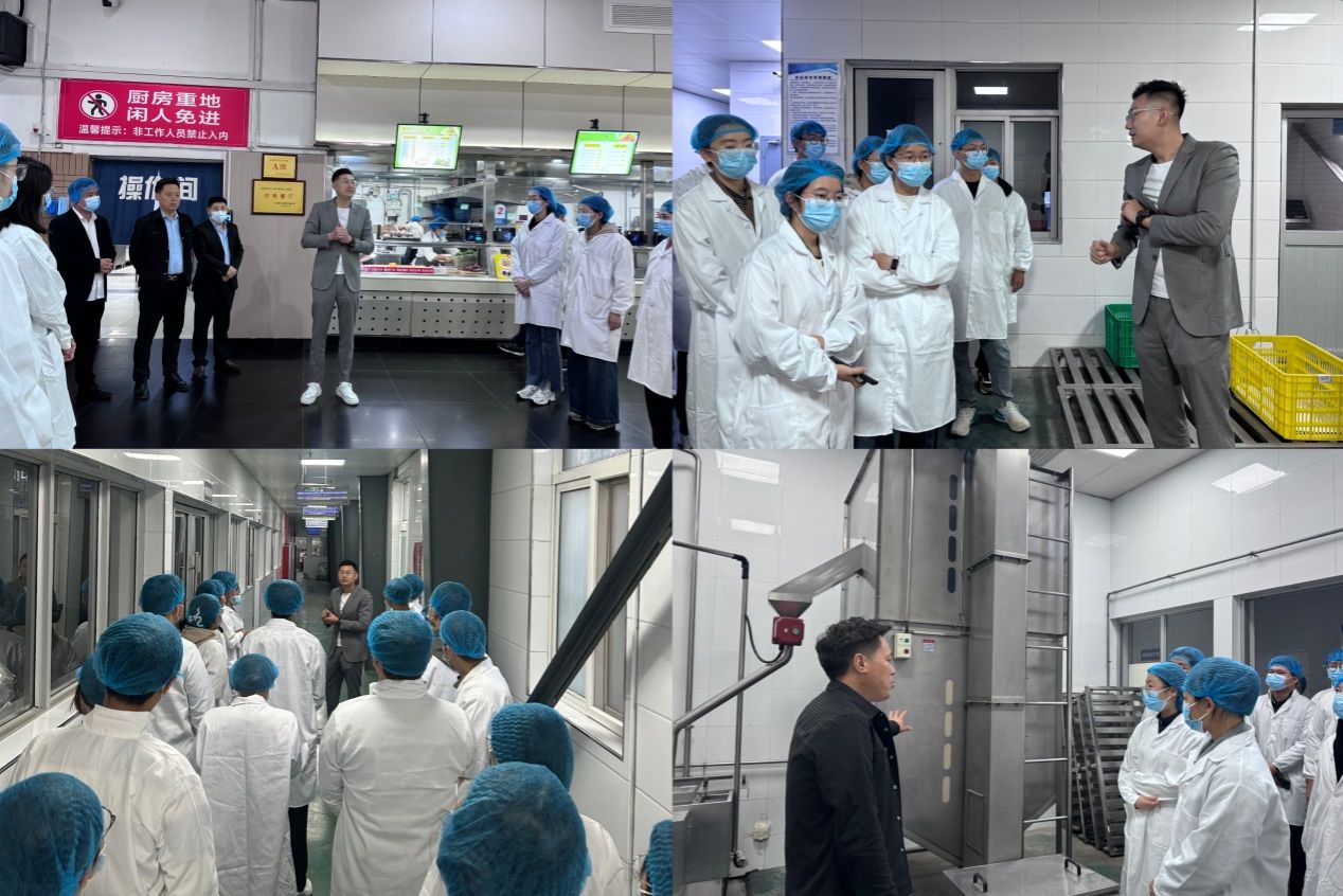早餐供应时段,同学们根据丁香餐厅规范化管理要求统一穿着工作服、佩戴防尘帽与口罩进入后厨。韩睿副部长带领大家依次参观了食物配送处、菜品储存间、粗加工间、切配烹饪间、洗刷消毒间等区域,详细介绍了餐厅后厨各个工作区间的工作制度、运行情况和员工工作内容,讲解了原材料的储存、食品加工流程、食品留样、餐具消毒以及相关食品安全的规范操作。随后同学们来到公司中心厨房,这里作为南校区食堂米饭、馒头、面条等主食成品的供应、集散地,使用了效率高、科技化、精细化的大型烹饪设备,既保证了师生餐食供应,更把控了食品烹饪质量关。直观式、沉浸式的参观,加深了同学们对后勤餐饮专业化服务的了解,更了解到公司对食品卫生、食品安全的严格要求。