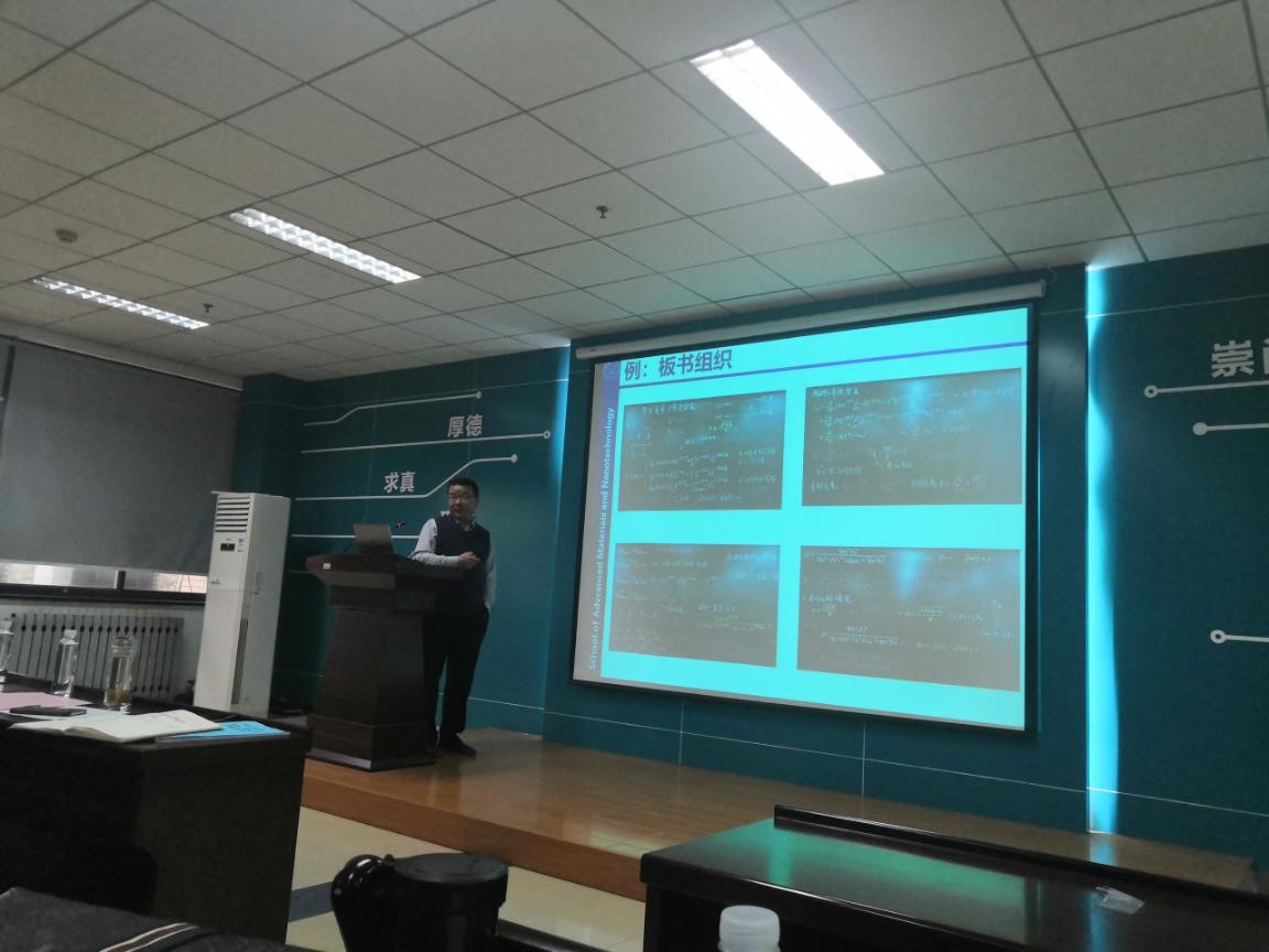 李培咸教授以省级精品课程《量子力学》的教学为例,探讨如何将思政教育巧妙渗透教学的全过程,润物无声,真正落实课程育人的实效。李老师提出,教师本身就是课程思政,认真的对待教学,就是课程思政的基础。教师对待课程的态度,会影响员工的学术性格,教师对外部世界各类问题的看法,会潜移默化的影响员工的世界观、人生观、价值观。针对青年教师,李老师说,针对不同的课程要充分借助不同的教学手段,没有一定之规。比如,《量子力学》课程板书效果最佳,容易让员工更直观感受公式,理解计算推导的过程;但是,像《线性代数》等,存在大量简单重复的行列式、矩阵等的表示,就最好借助PPT教学,以推进教学进度。