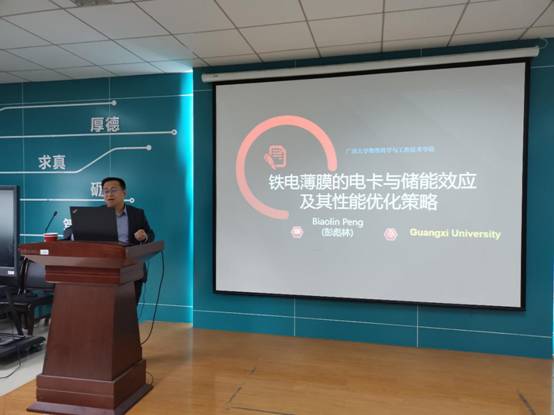 本次报告中,彭彪林教授以铁电薄膜的溶胶凝胶制备方法、室温附近电卡制冷效应等七大板块为主线为大家详细介绍了铁电薄膜优异的电卡、储能、压电、电致应变等一系列强场电学性能等相关知识。同时,彭彪林教授也在学术报告的同时和大家分享了自己的科研经历,鼓励大家要善于在科研实验过程中发现问题,开拓新思路,不畏艰难,勇于攀登科研高峰。彭教授的报告不仅对铁电薄膜的制备和应用做了详尽细致的讲解,还对到场师生在科研思路和研究方法上给予了很大的启发。报告结束之后,老师和员工们与彭教授就学术问题和研究体会进行了深入的探讨。