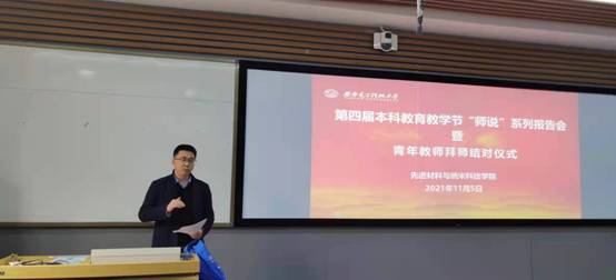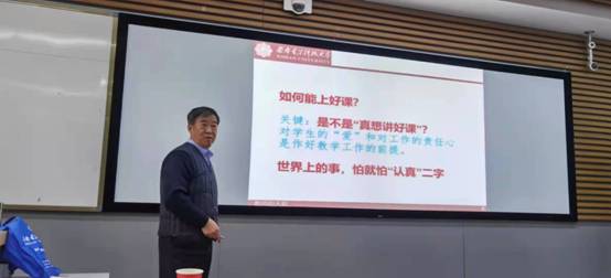 在报告中,曹老师从对待教学工作的态度、教学基本功锤炼、课后反思、课程思政几个方面娓娓道来。他认为一名优秀的教师,主要体现在他的课堂教学质量高,有自己独特的教学风格,教学技能与方法出色,课堂教学组织能力强。而这种能力的养成是一个长期的过程,绝非一日之功,需要不断地培养与锻炼才能获得和提高。